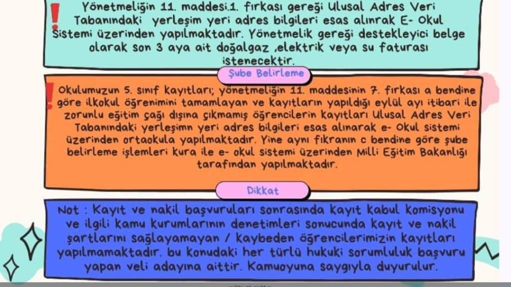 5-Okulumuz ortaokulunun beşinci sınıflarına kayıtlar; yönetmeliğin 11’nci maddesinin 7’nci fıkrasının a bendine göre İlkokul öğrenimini tamamlayan ve kayıtların yapıldığı eylül ayı sonu itibarıyla zorunlu öğrenim çağı dışına çıkmamış öğrencilerin kayıtları ulusal adres veri tabanındaki yerleşim yeri adres bilgileri esas alınarak e-Okul sistemi üzerinden ortaokula yapılmaktadır. Yine aynı fıkranın c bendinde yazılı “Ortaokul ve imam-hatip ortaokuluna kaydı yapılan öğrencilerin şubeleri kura yöntemi ile e-Okul sistemi üzerinden Bakanlıkça belirlenir” hükmüne göre sınıflar oluşturulacaktır.